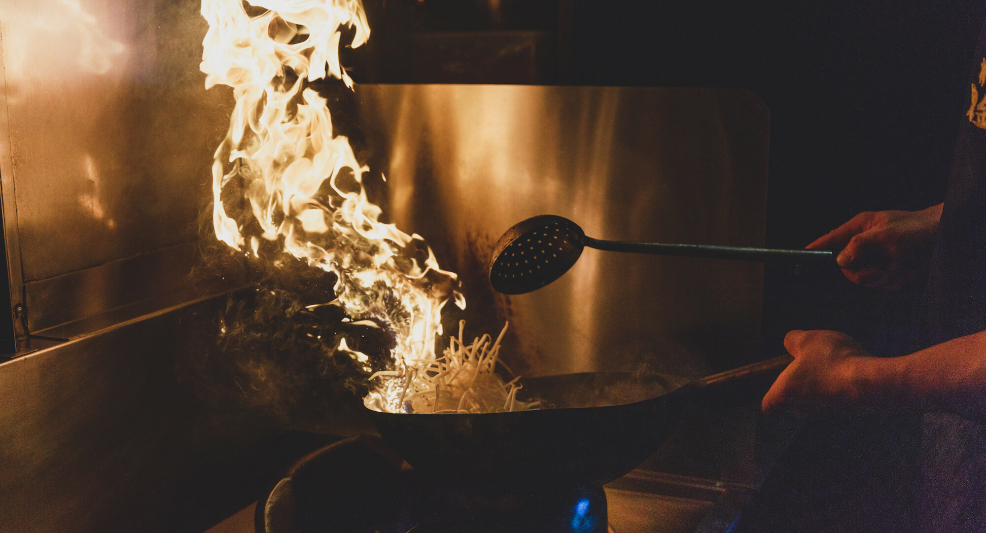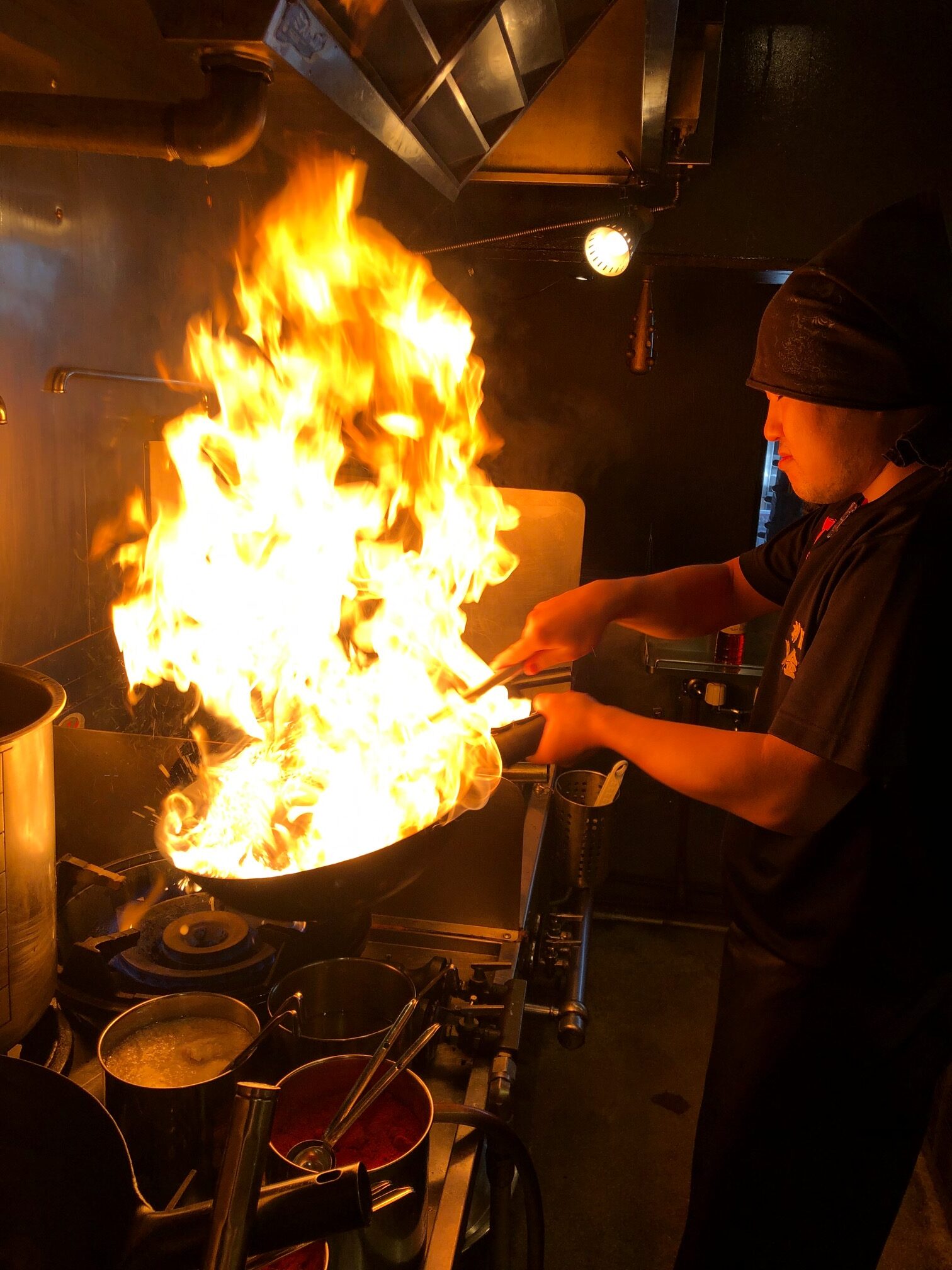 店内は鬼のお面や和太鼓の音色に満ち、活気ある調理場からは勢いよく火柱が上がり、スパイスの香りが鼻腔をくすぐります。暖簾をくぐれば広がる鬼金棒の世界を、五感でご堪能ください。