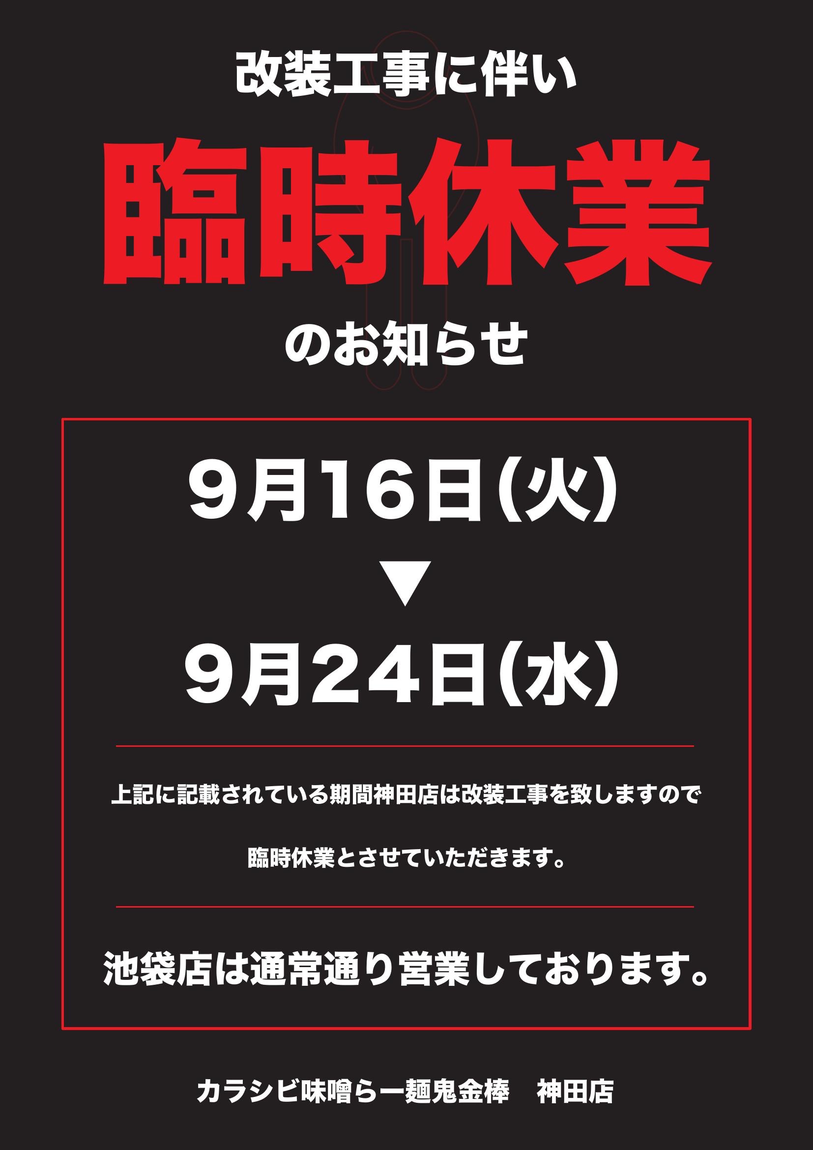 いつもご愛顧いただきありがとうございます。 誠に勝手ながら、鬼金棒 神田店の改修工事を行います。 9/16〜9/24の期間中は一時的にお休みとさせていただきます。 何卒ご理解賜りますようお願い申し上げます。