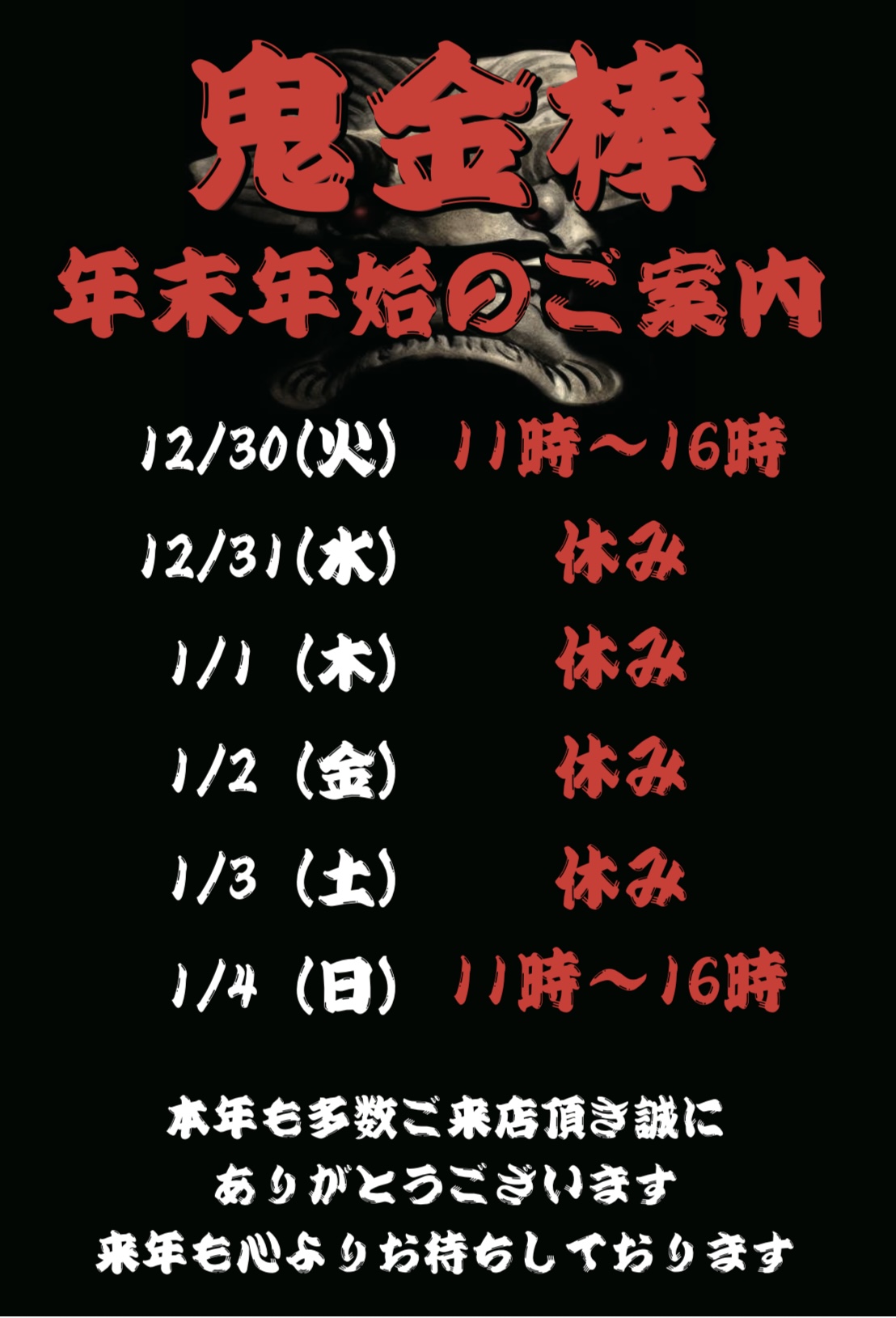 お買い物サイト『madeの土産 鬼金棒』の年末年始の発送について12月27日~1月3日までお休みいただきます。 年明け1月4日より再開致します。 ご注文いただいた商品は、1月7日より順次発送いたしますので予めご了承ください。