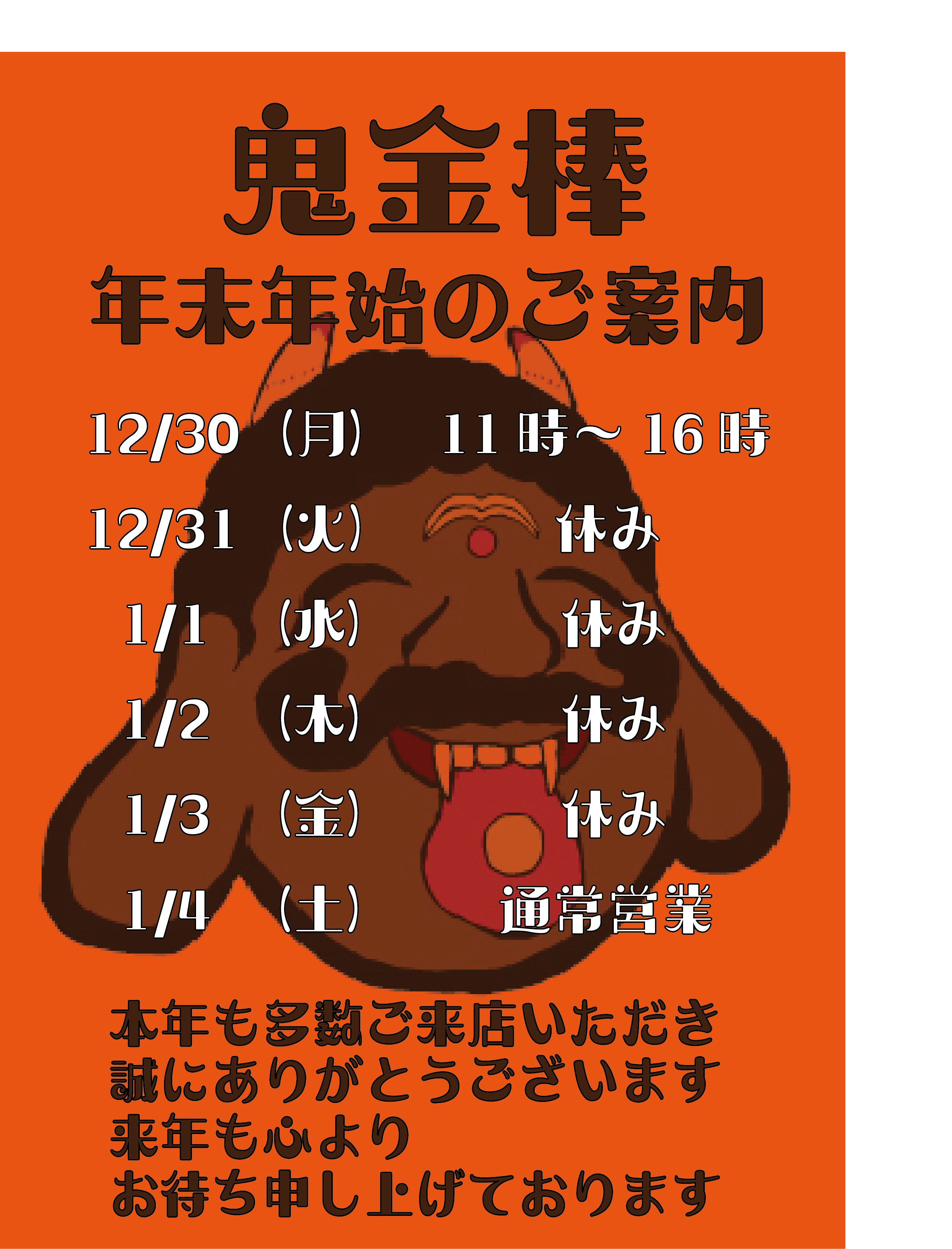 お買い物サイト『madeの土産 鬼金棒』の年末年始の発送について12月27日~1月3日までお休みいただきます。 年明け1月4日より再開致します。 ご注文いただいた商品は、1月7日より順次発送いたしますので予めご了承ください。