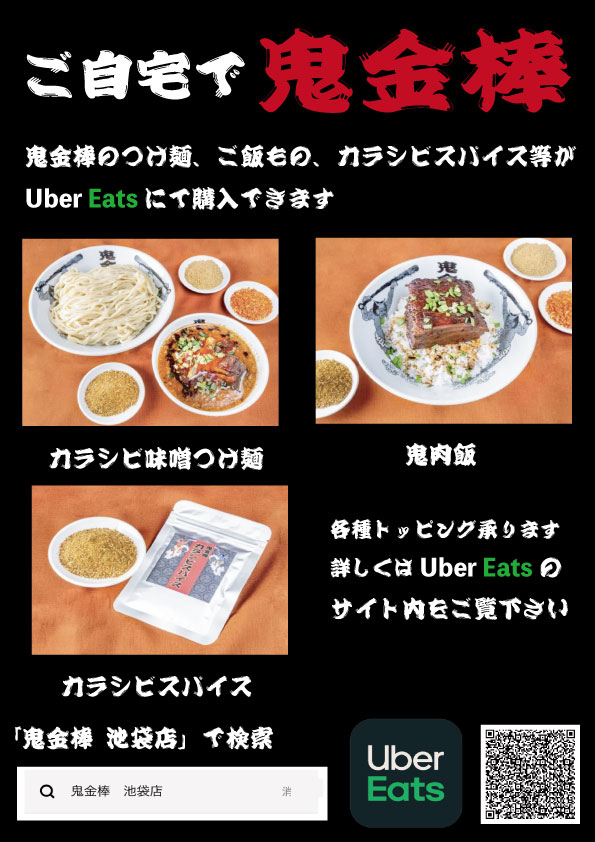 池袋店にてUber Eats始めました。 Uber Eats限定の『カラシビ味噌つけ麺』や『鬼肉丼』をお届けします。 Uber Eats カラシビ味噌らー麺 鬼金棒 池袋店